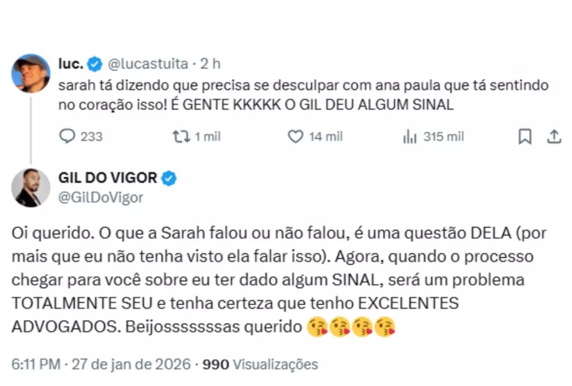 O economista e ex-BBB Gil do Vigor foi alvo de acusações nas redes sociais de que teria passado informações externas para a participante Sarah Andrade durante uma ação de patrocinador no BBB 26. Internautas levantaram suspeitas de que o ex-brother teria usado gestos ou frases para beneficiar a amiga dentro do confinamento.