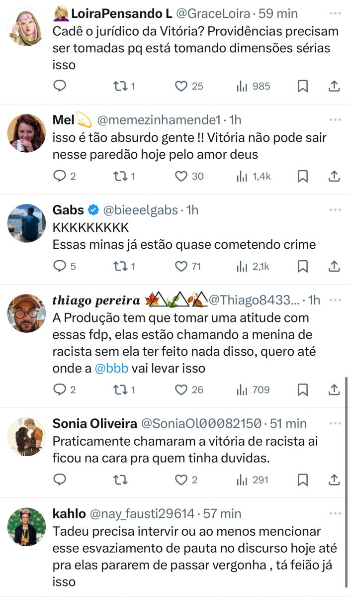 Em outro momento, Thamiris abordou uma questão racial: “Pra você não ser racista, você tem que ser antirracista e tem que ter atitudes assim. Você não tem que ter fala preconceituosa, tem que saber seu lugar de fala, tem que saber como falar com uma pessoa preta para não colocar ela nesse lugar [de agressiva]”, afirmou.