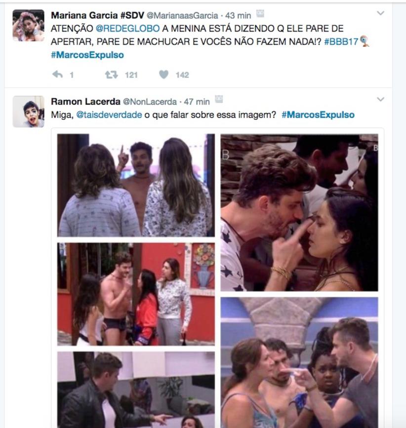 Fãs dela e até adeptos de torcidas rivais da gaúcha estão revoltados com a situação, condenando as atitudes do cirurgião plástico e pedindo a expulsão do participante, que está no paredão deste domingo. A hashtag #MarcosExpulso é a mais comentada nos Trending Topics do Twitter.