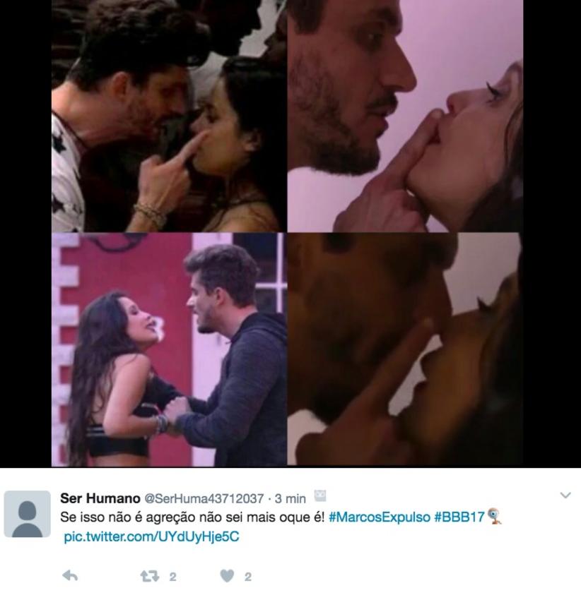 A cena acontece quando os dois estão brigando e o médico a pega pelo pulso. A jovem pede para ele parar: "Marcos! Marcos! Tá doendo!". Em outro vídeo, o brother aparece segurando a garota pelo cabelo. Mais tarde, os dois conversam e ela fala para o médico: "Tu me beliscou de novo, Marcos. Tu apertou meu pulso, tá doendo". Em outro momento, ela diz: "Para de me apertar! Chega! Para de me apertar, para de me machucar".