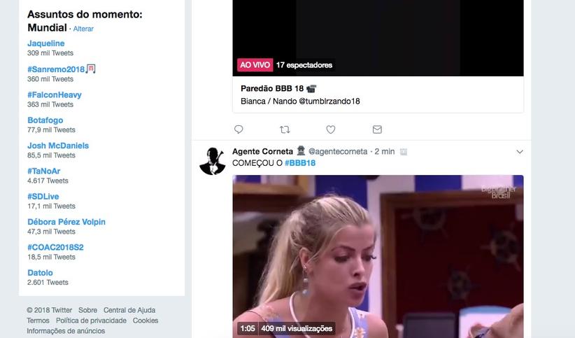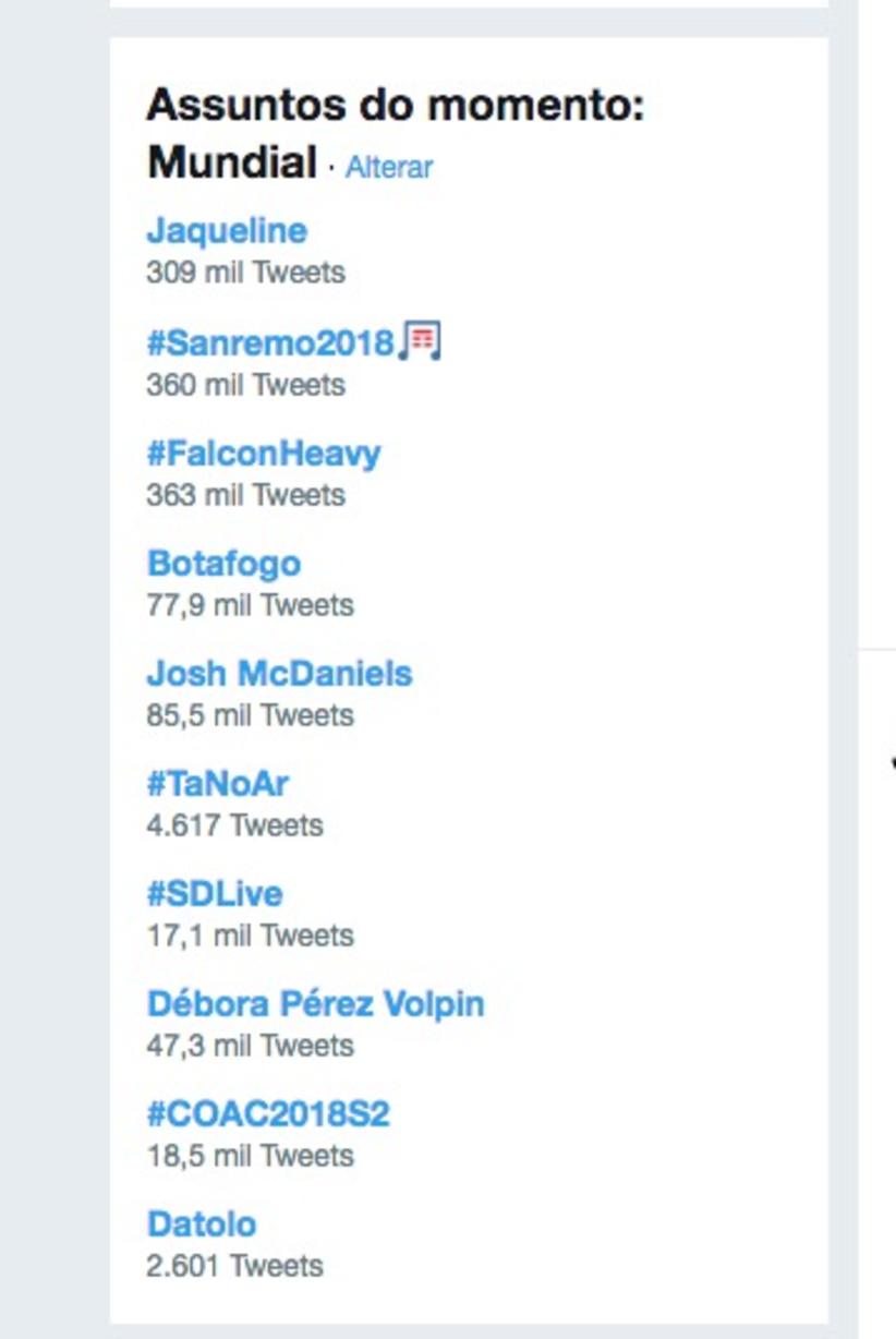 O nome de Jaqueline ficou no topo dos assuntos mais comentados no Trending Topics do Mundo na noite desta terça-feira (6), após a sister ser eliminada no Big Brother Brasil 2018.
