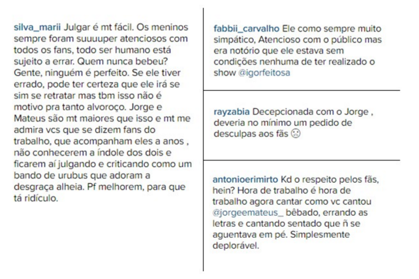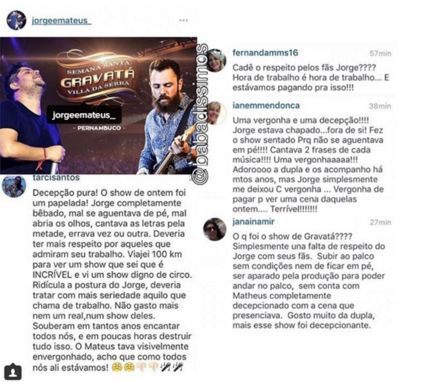 Após a apresentação dos sertanejos, alguns internautas foram no perfil do Instagram de Jorge, falar sobre o assunto. "Cadê o respeito pelo fãs, hein? Hora de trabalho é hora de trabalho. Agora, como você cantou bêbado, errando as letras e cantando sentado, porque não se aguentava em pé. Simplesmente deplorável", questionou um seguidor.