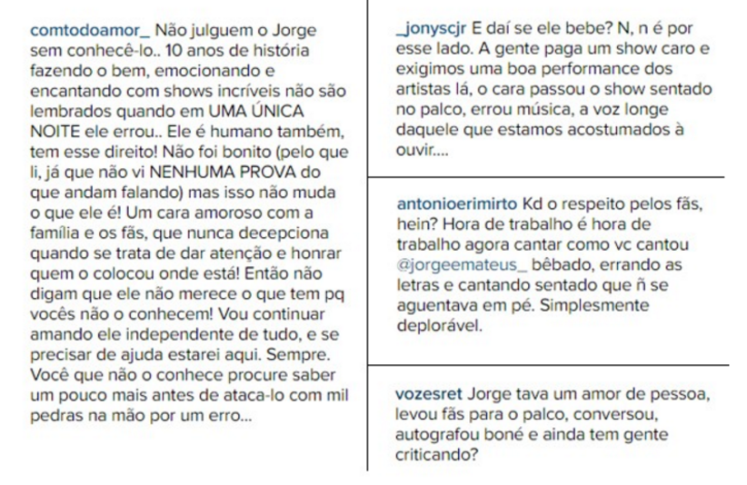 Outros fãs resolveram defender o sertanejo. . "Não julguem o Jorge sem conhecê-lo. Dez anos de história fazendo o bem, emocionando e encantando com shows incríveis. Não são lembrados quando uma única noite ele errou... Ele é humano e também tem esse direito. Não foi bonito (pelo que li, já que não vi nenhuma prova do que andam falando), mas isso não muda o que ele é!", defendeu. "Jorge estava um amor de pessoa, levou os fãs para o palco, conversou, autografou boné e ainda tem gente criticando?", completou outra.