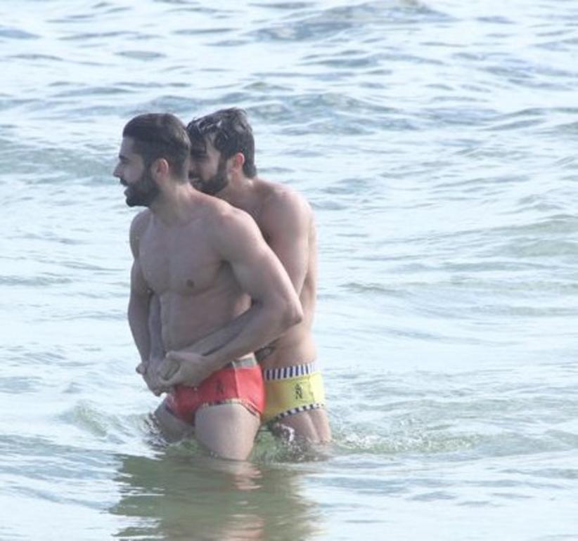 O ex-ator pornô e atual empresário e DJ Harry Louis, foi clicado na praia durante esta quinta-feira, enquanto beijava muito o seu novo namorado, o modelo Allyson Chinalia. Os dois estavam acompanhados da amiga, a ex-coleguinha do Calderão do Huck, Mary Silvestre.