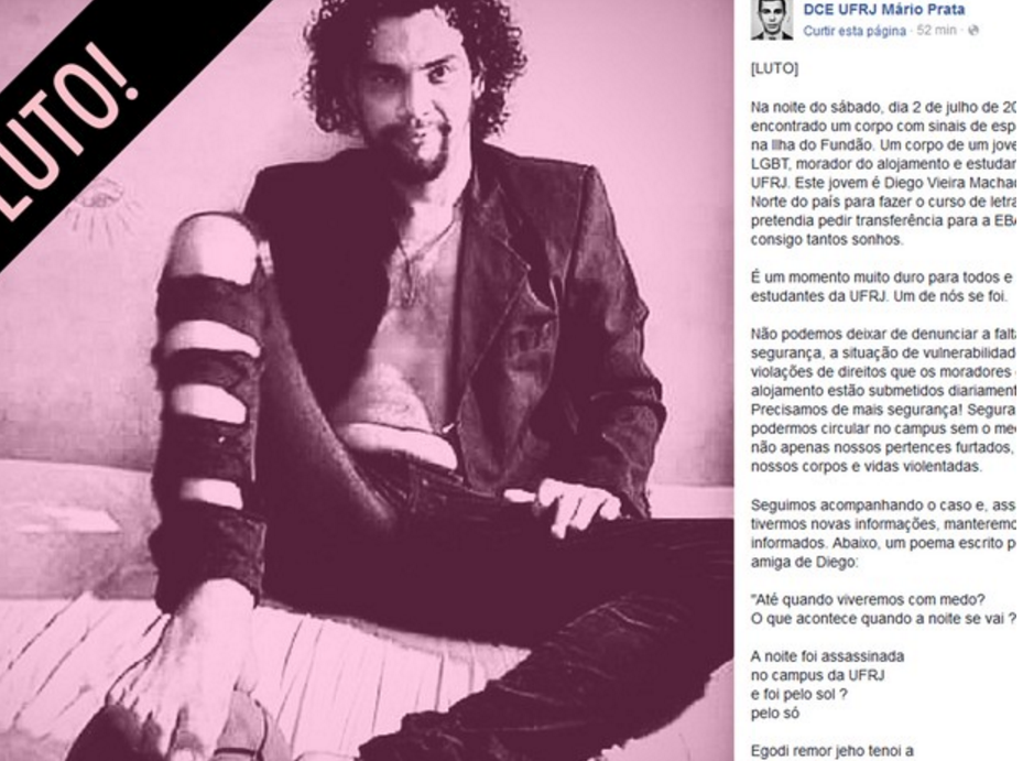 "Na noite do sábado, dia 2 de julho de 2016, foi encontrado um corpo com sinais de espancamento na Ilha do Fundão. Um corpo de um jovem, negro, LGBT, morador do alojamento e estudante da UFRJ. Este jovem é Diego Vieira Machado, veio do Norte do país para fazer o curso de letras e pretendia pedir transferência para a EBA, trazendo consigo tantos sonhos. É um momento muito duro para todos e todas estudantes da UFRJ. Um de nós se foi. Não podemos deixar de denunciar a falta de segurança, a situação de vulnerabilidade e violações de direitos que os moradores do alojamento estão submetidos diariamente. Precisamos de mais segurança! Segurança para podermos circular no campus sem o medo de ter não apenas nossos pertences furtados, mas nossos corpos e vidas violentadas”.