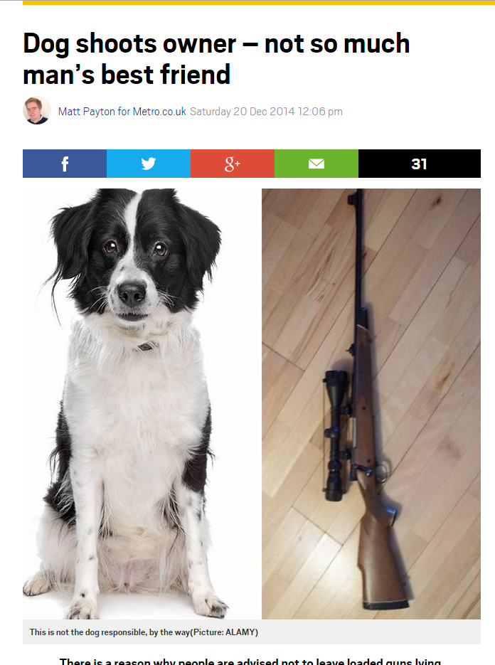 O cachorro de estimação de Richard L Fipps, que estava no seu carro durante passeio, saltou do banco da frente para o de trás e acidentalmente, disparou o rifle .300 Winchester Magnum de seu dono, que por sorte, ficou ferido apenas no braço esquerdo com o tiro, evitando uma tragédia.