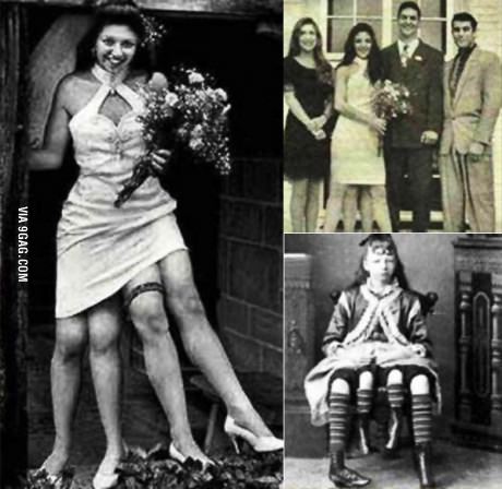 Myrtle Corbin (1865-1928) nasceu no condado de Lincoln – EUA. Agora se você pensa que ela andava com as quatro pernas, você vai se decepcionar, pois das suas quatro pernas apenas uma funcionava normalmente. Os dois membros a mais seriam de uma “irmã gêmea”, que acabou não se desenvolvendo e se fundiu ao corpo de Myrthe.