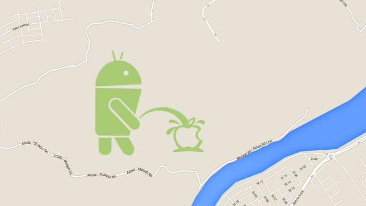 Um terreno ao sul da cidade de Rawlpindi, no Paquistão, esconde um desenho do robô símbolo do Android urinando sobre uma maçã (símbolo da Apple) no Google Maps.