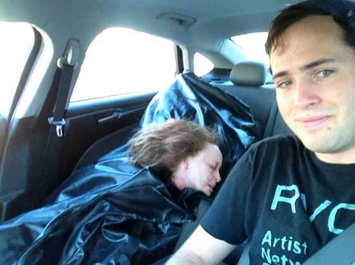 Ela mostra um homem posando para selfie com o cadáver da namorada. Como muitos especularam, a “namorada morta” na verdade estava muito bem de saúde.