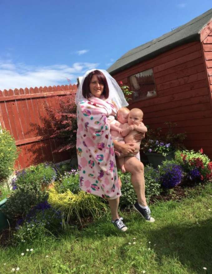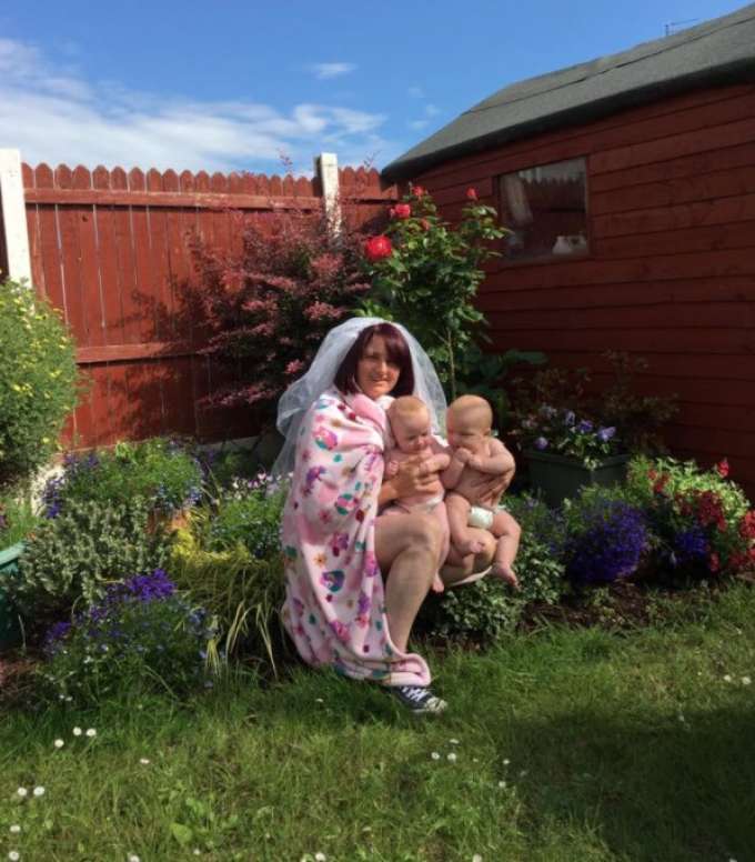 Sharon Kellaway se inspirou a na imagem e reproduziu uma parecida e engraçada. A mãe pegou os bebês, os levou para o jardim de casa e convocou Megan, o filho de 6 anos irmão mais velho dos pequenos Senam e Zoe, para tirar as fotos.