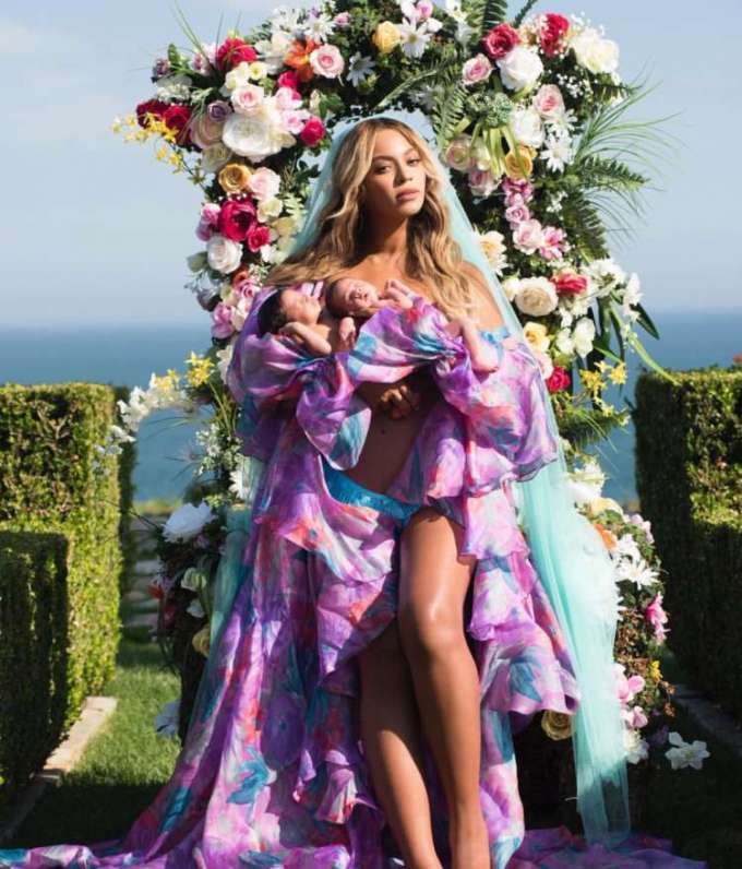 A foto divulgada no Instagram pela cantora Beyoncé com os gêmeos Rumi e Sir Carter rendeu muito na Internet. Na foto ela aparece diante de um arranjo floral segurando os filhos no colo.