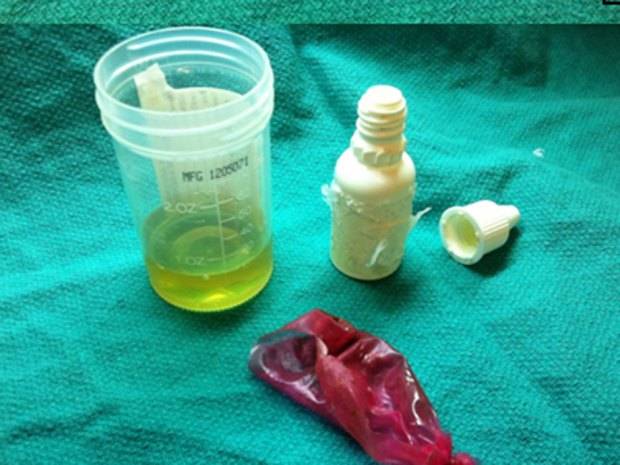 O paciente infeliz admitiu ter inserido o frasco de urina, de um amigo, dentro de seu ânus, a fim de usá-lo mais tarde para passar por um teste de drogas.