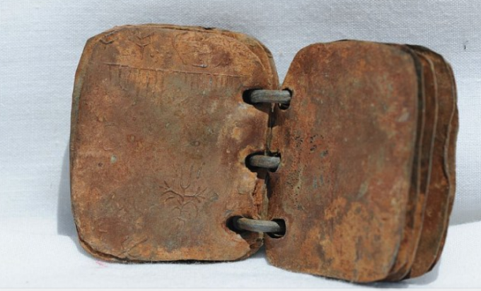 As placas foram encontradas por um beduíno, em 2008, numa caverna na Jordânia. Elas são feitas de folhas de chumbo mantidas juntas como um fichário.