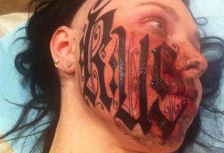 A tatuagem mede cerca de 12cm e cobre todo o rosto de Lesya Toumaniantz .