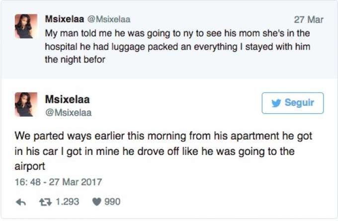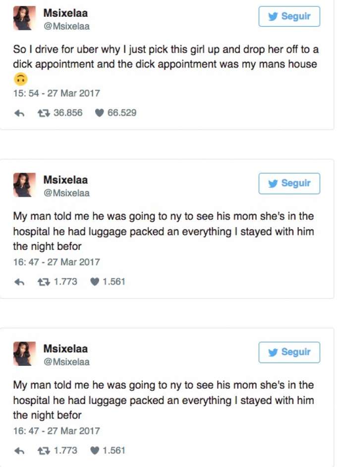 Msixelaa usou as redes sociais para desabafar após descobrir a traição. “Eu dirijo para o Uber. Peguei essa menina e levei a um encontro, o encontro era na casa do meu namorado”, contou.
