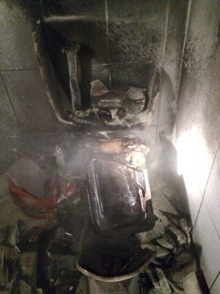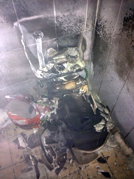 Mas, como a funcionária havia acabado de fazer a limpeza do cômodo, a combinação do fogo com os produtos químicos causou uma explosão no local. O sanitário explodiu.