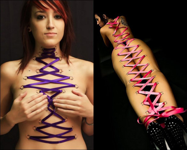 Uma nova mania bizarra vem atraindo atenção de mulheres, que colocam anéis de metal no corpo para trançar fitas coloridas e criar espartilhos "mais naturais".