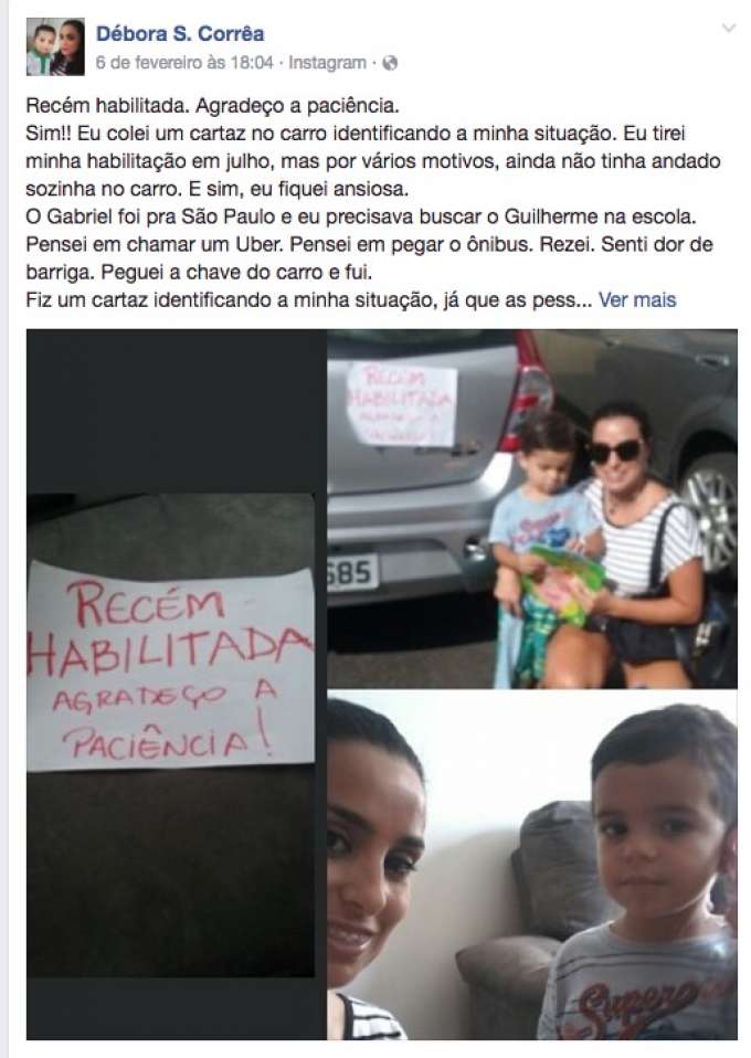 Em publicação feita no Facebook, Débora contou sobre a sua primeira experiência. "Pensei em chamar um Uber. Pensei em pegar o ônibus. Rezei. Senti dor de barriga. Peguei a chave do carro e fui”.