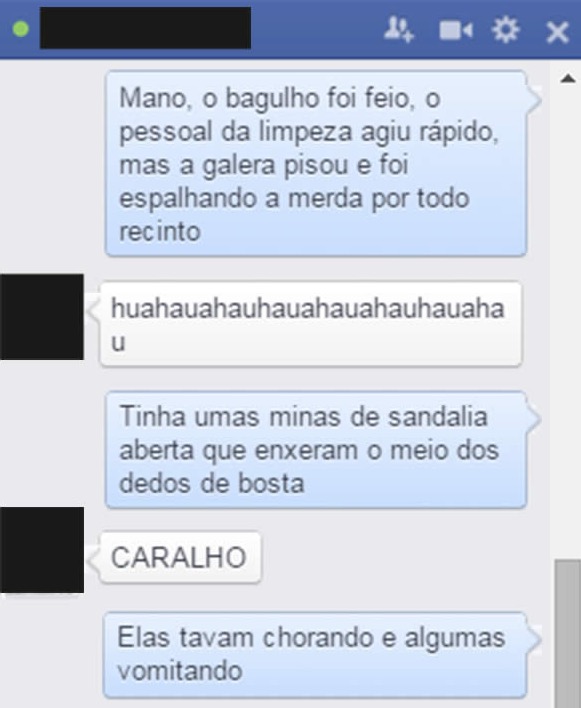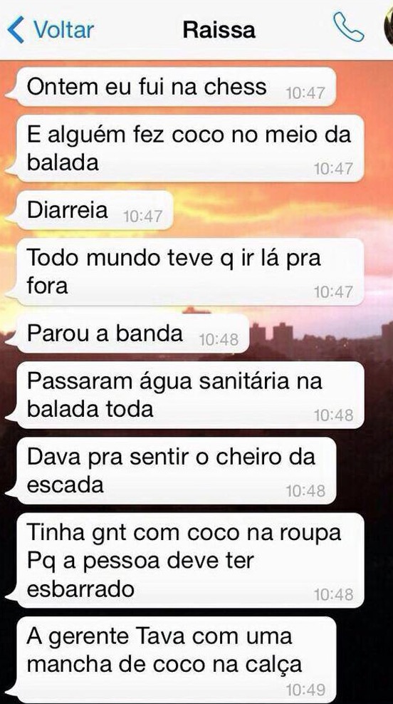 "Tinha gente com cocô na roupa", disse uma das frequentadoras que narrou pelo WhatsApp a situação. O cheiro foi tão forte, que a equipe de limpeza teve bastante trabalho para limpar tudo, inclusive com água sanitária.