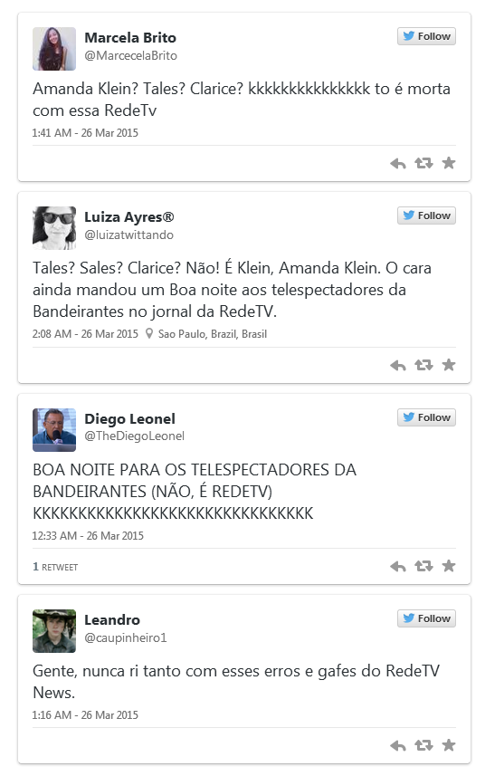 A próxima gafe aconteceu quando o mesmo senhor foi dar boa noite ao público que assistia ao jornal e trocou o nome da emissora. "Boa noite aos telespectadores da Bandeirantes", disse. Assim que percebeu o erro, ele se corrigiu. "Telespectadores da RedeTV!", disse. Assista a cena a seguir: