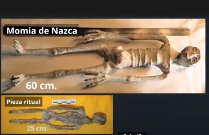 As imagens exibidas na Câmara dos Deputados mostram corpos mumificados de dois seres que foram encontrados fossilizados nas Linhas de Nazca, no Peru, no ano de 2015.