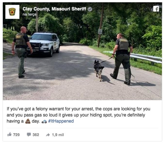 A circunstância incomum foi registrada no Facebook do departamento de polícia do condado com a legenda: “Se foi emitido um mandado de prisão com o seu nome, os policiais estão te procurando e você solta um pum tão alto que eles te encontram, você certamente está tendo um dia ruim. #Aconteceu”