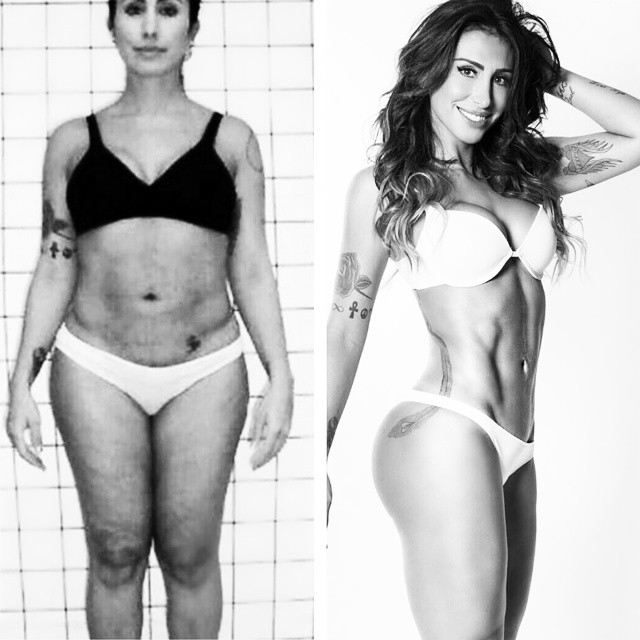 Dia 24 de janeiro dei à luz de parto cesáreo porque tive pré-eclampsia e não consegui parto normal. Estava com quase 90 quilos! O pós-parto foi sofrido e dolorido. Cuidar do bebê com o corte de uma cirurgia não é fácil. Ainda tinha que passar horas com a bombinha para tirar leite porque o meu era pouco. No primeiro mês com Gael, não tinha tempo nem de comer direito, nem de dormir. Não aceitava ajuda de ninguém, e só brigava com meu marido por raiva de ele existir, por raiva de ele sair de casa e eu ficar trancada, tadinho. Fora meu corpo que estava inchado e cheio de celulites Às vezes, acho que toda essa mudança brutal além de fatores hormonais colaboram, sim, para depressão pós-parto. As mamães acham que vão levar aquela vida para sempre. Mas o tempo age a nosso favor, o corpo melhora, o bebê melhora e o nosso relacionamento volta ao normal. Fora que depois do parto, nosso corpo otimiza tudo de bom para a gente. Tudo faz efeito mais rápido. Mas não pensem vocês que fiz plástica ou loucuras. Ou que passei horas na academia. Que parei de cuidar do filho para me cuidar. Isso não existe. Eu parei, sim, de comer besteira, não bebo, e malho 3x por semana. O que aconteceu é disciplina e paciência. Paciência. O corpo leva pelo menos 6 meses para voltar. Recebo email de mamães desesperadas no primeiro mês de parto. Calma meninas! Todas vcs podem ter um resultado bacana. Basta se adaptar a cada situação e saber esperar. Porém, nunca deixem de amamentar para fazer dieta ou se cuidar. Todas vcs podem melhorar no pós-parto. Tenham paciência e não entrem em deprê. Na primeira foto estava com 60 dias do pós-parto e na segunda 7 meses após o parto.