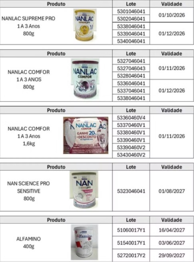 A proibição atinge lotes específicos das marcas Nestogeno, Nan Supreme Pro, Nanlac Supreme Pro, Nanlac Comfor, Nan Sensitive e Alfamino. Para saber se a lata que você possui em casa faz parte do recall, siga estes passos:
