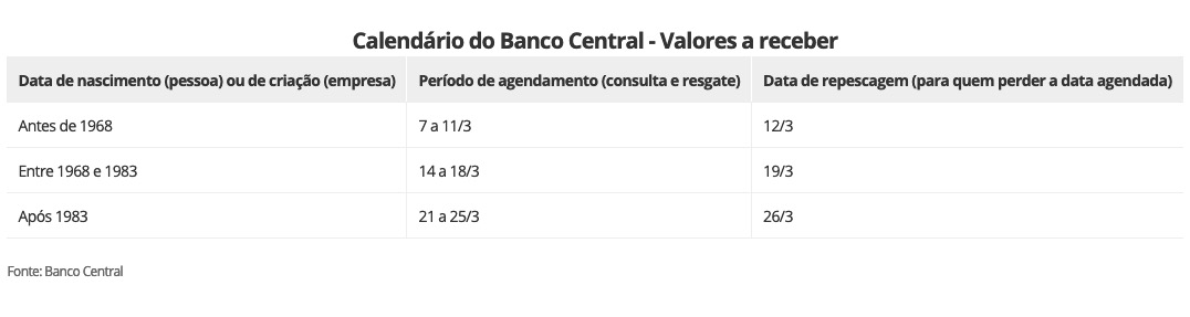 Após a consulta, o cliente recebe uma data e período para consultar e solicitar o resgate do dinheiro disponível. Veja o calendário: