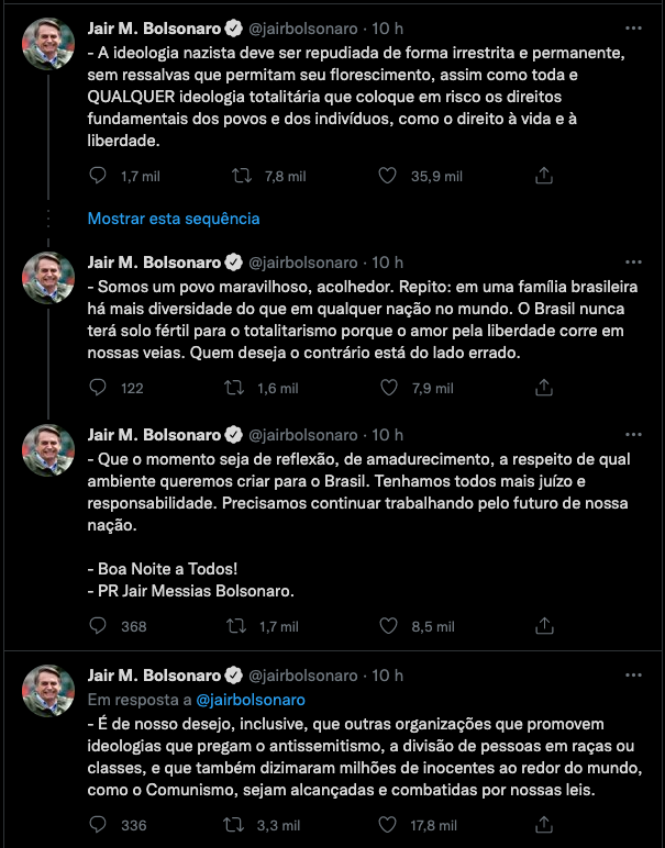 O presidente Jair Bolsonaro publicou nas redes sociais uma série críticas e condenou quem faz apologia ao nazismo e prestou solidariedade aos judeus. A declaração ocorre após a repercussão de uma fala do youtuber Monark em favor da criação de um partido nazista durante um episódio no podcast Flow e também de um gesto do comentarista Adrilles Jorge que foi parecido com o Sieg Heil, uma saudação nazista, na TV Jovem Pan News.