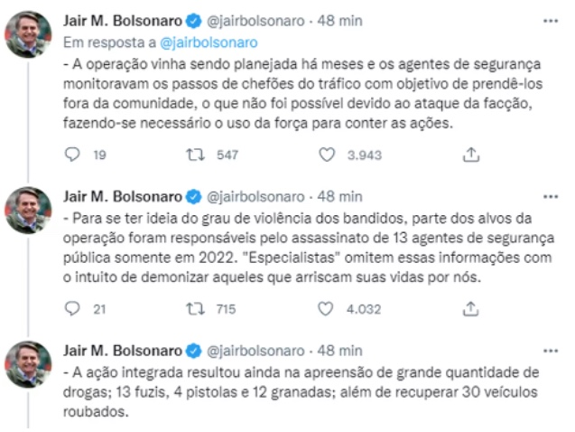 Ele também afirmou que parte dos alvos foi responsável pelo assassinato de 13 agentes de segurança pública em 2022, e acusou especialistas de omitirem essas informações "com o intuito de demonizar aqueles que arriscam suas vidas por nós. A ação integrada resultou ainda na apreensão de grande quantidade de drogas, 13 fuzis, 4 pistolas e 12 granadas, além de recuperar 30 veículos roubados", declarou Bolsonaro.