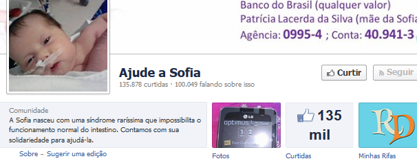 Uma página no Facebook chamada Ajude a Sofia já tem mais de 135 mil curtidas com um grau de engajamento altíssimo, face o empenho de pessoas de diversos lugares para conseguir o dinheiro necessário para realizar a cirurgia da pequena, orçada em 2 milhões de reais.
