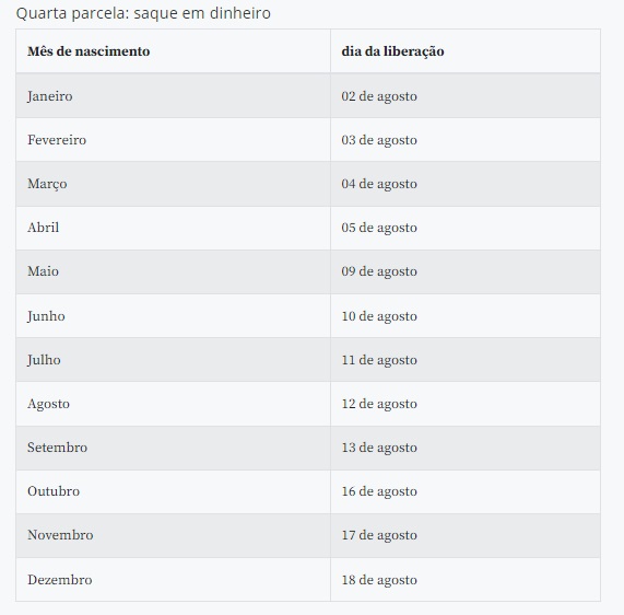 No último dia 15, a Caixa anunciou a antecipação do pagamento da quarta parcela. O calendário de depósitos, que começaria na última sexta-feira (23) e terminaria em 22 de agosto, teve o início antecipado para o último dia 17 e será concluído em 30 de julho.