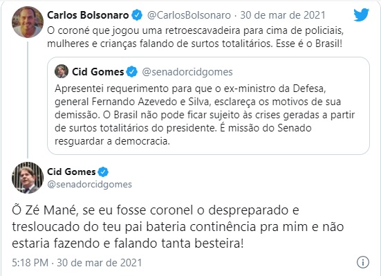 O senador Cid Gomes (PDT-CE) e o vereador Carlos Bolsonaro (Republicanos-RJ) protagonizaram uma discussão acalorada no Twitter, nesta terça-feira (30), após o senador criticar as recentes trocas de ministros no governo Bolsonaro.