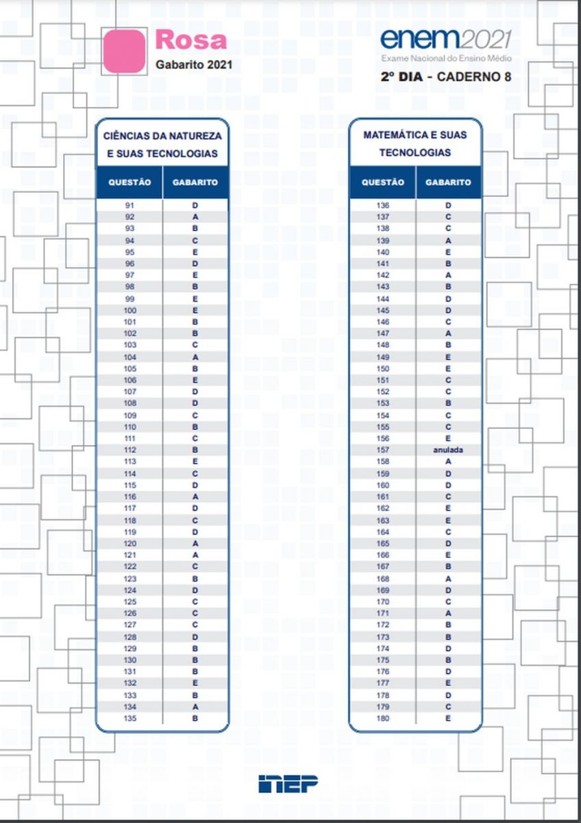 A questão 157 da prova rosa, que é uma alternativa sobre a Copa do Brasil, foi anulada, pois não existia uma resposta correta entre as opções. A mesma questão, corresponde às de número 138 da prova azul, 155 da prova cinza e 178 da prova amarela.