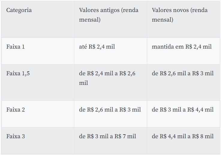 Cada faixa tem subsídios e programas diferenciados. Segundo o Conselho Curador do FGTS, a atualização das faixas de renda tem como objetivo destravar o programa habitacional e melhorar as condições para as construtoras, pressionadas pelo aumento dos custos, pelos juros altos e pela inadimplência.