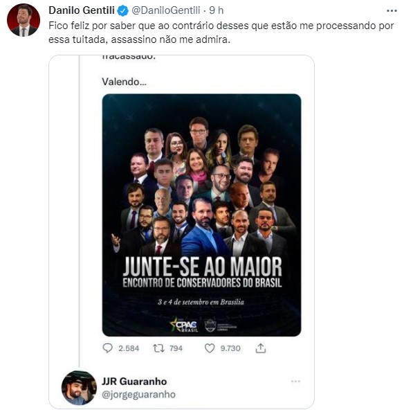 Gentili recuperou a postagem e disse: “Fico feliz por saber que ao contrário desses que estão me processando por essa tuitada, assassino não me admira”.