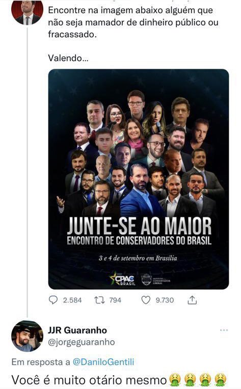 No twitter, o apresentador recuperou a publicação que mostra a foto de vários bolsonaristas, como o ex-secretário de Cultura Mários Farias e o deputado federal Eduardo Bolsonaro, com a seguinte mensagem: “Encontre na imagem alguém que seja mamador de dinheiro público ou fracassado”, escreveu Gentili.