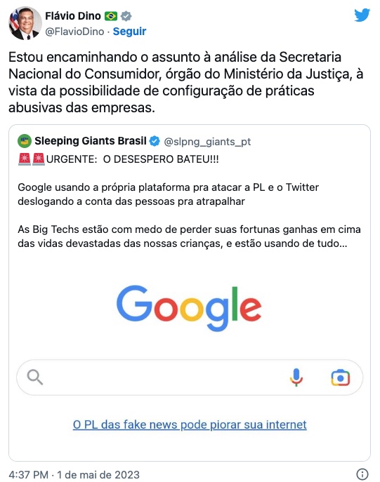 Ao fazer o anúncio em sua conta oficial, o ministro compartilhou uma publicação da organização de combate à desinformação Sleeping Giants Brasil, segundo a qual a empresa Google estaria “usando a própria plataforma para atacar a PL e, o Twitter deslogando a conta das pessoas para atrapalhar”.