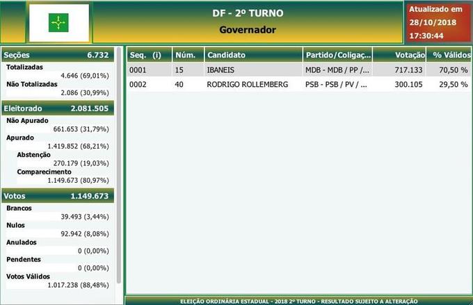 Com 80,99% das urnas apuradas no Distrito Federal, Ibaneis (MDB) está eleito novo governador alcançando 70,45% dos votos. O atual governador Rodrigo Rollenberg (PSB) está com 18,95%.