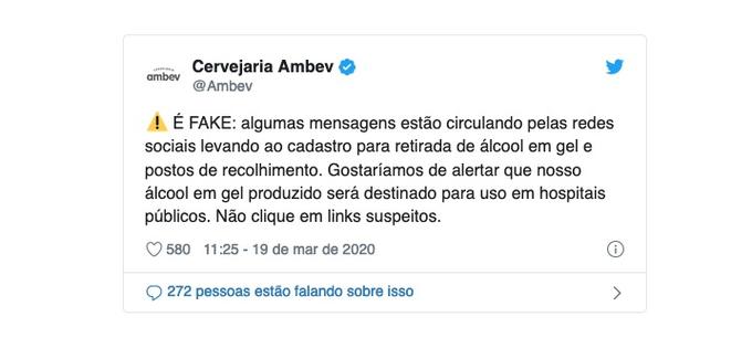 Outro golpe envolve a cervejaria Ambev, que diz que a empresa vai doar álcool em gel e para receber é preciso fazer um cadastro. No Twiiter a propria Ambev alertou sobre o golpe.