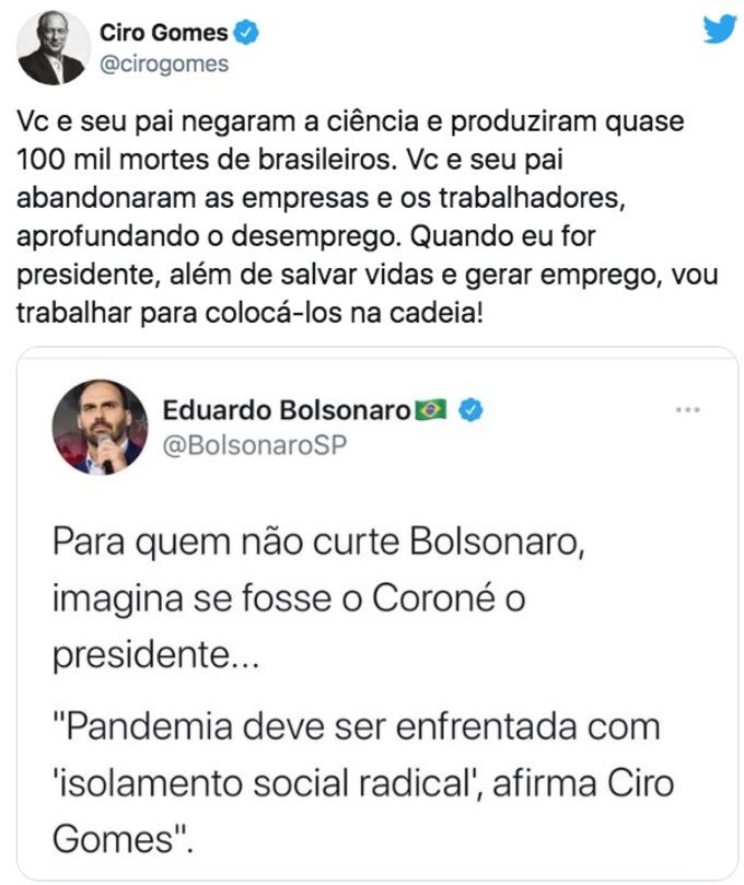 Ciro, então, rebateu: “Você e seu pai negaram a ciência e produziram quase 100 mil mortes de brasileiros. Você e seu pai abandonaram as empresas e os trabalhadores, aprofundando o desemprego. Quando eu for presidente, além de salvar vidas e gerar emprego, vou trabalhar para colocá-los na cadeia”, disparou.