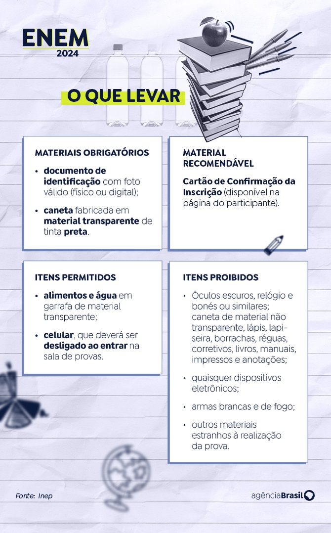 As demais recomendações são de levar os materiais obrigatórios e não portar itens proibidos: