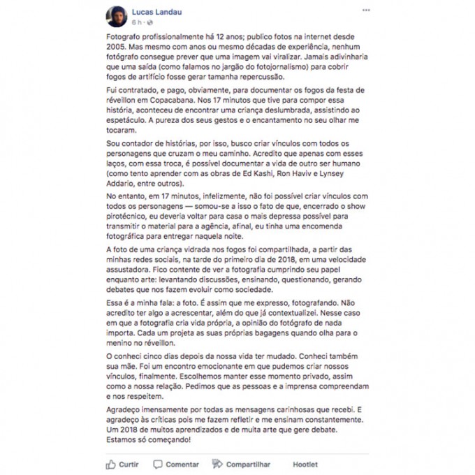 O fotógrafo Lucas Landau afirmou ter encontrado o garoto de sua famosa foto durante o Réveillon em Copacabana (RJ). A imagem viralizou na internet e causou um grande debate sobre o assunto.