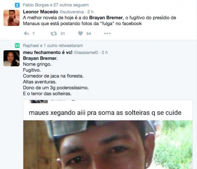 O fugitivo postou uma nova imagem onde dizia que estava indo para Maués, nesta segunda-feira (2). A zoeira do foragido foi tanta que ele acabou virando um dos assuntos mais comentados no twitter brasileiro.