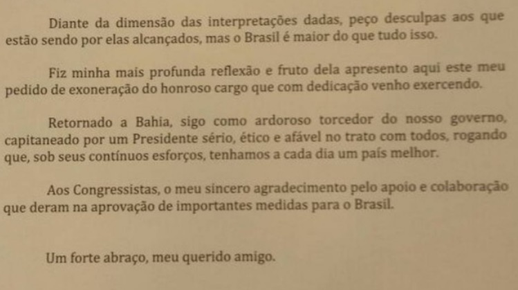 "Avolumaram-se as críticas sobre mim. Em Salvador, vejo o sofrimento dos meus familiares. Quem me conhece sabe ser esse o limite da dor que suporto. É hora de sair. Diante da dimensão das interpretações dadas, peço desculpas aos que estão sendo por elas alcançados, mas o Brasil é maior que tudo isso", diz o texto.
