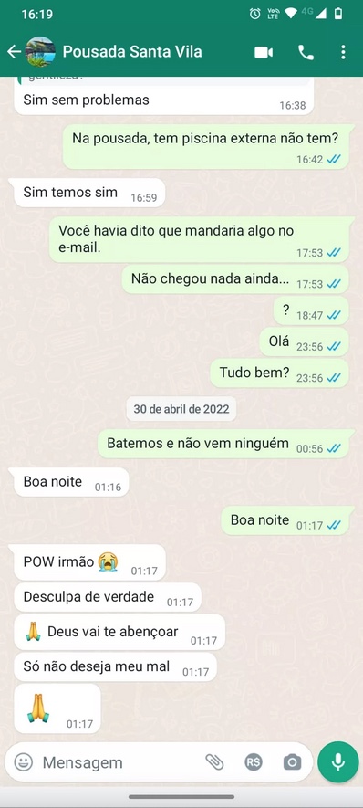 O consultor de sistemas, Rafael Ferreira da Costa, também foi vítima do estelionatário. Ele efetuou o pagamento no valor de R$ 800, chegou até a pousada chamou no portão e ninguém atendeu. Ele pediu ajuda através da conta no WhatsApp sem saber que havia sido hackeada e o golpista zombou, veja: