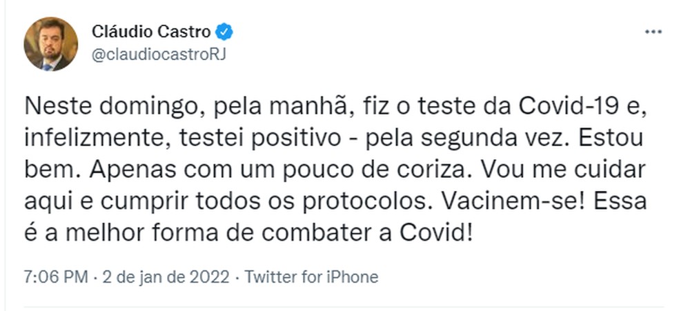 O governado do Rio de Janeiro, Cláudio Castro, testou positivo para Covid-19 pela segunda vez. A informação foi confirmada por ele, nesta domingo (02), em sua conta no Twitter.