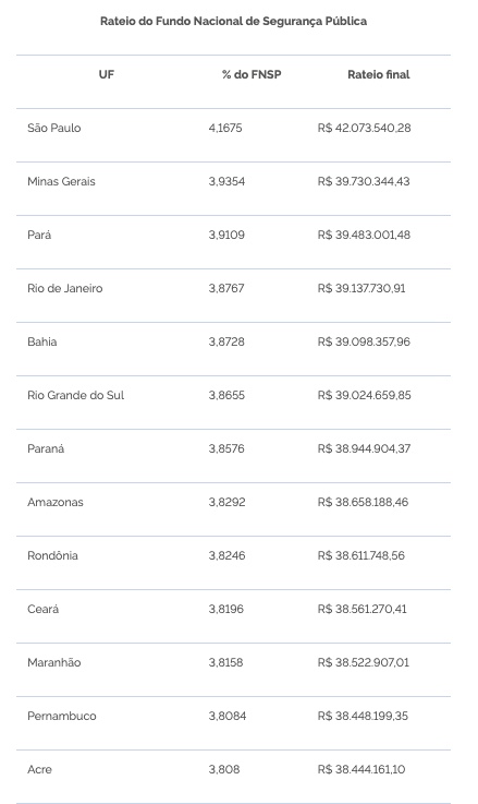 Em 2023, a parcela do FNSP repassada aos Estados será de R$ 1.009.563.054,00 (veja divisão abaixo). Além dos 80% para combater homicídios, 10% deverão ser destinados para ações de enfrentamento à violência contra mulheres e os outros 10% à melhoria da qualidade de vida dos profissionais da segurança pública.