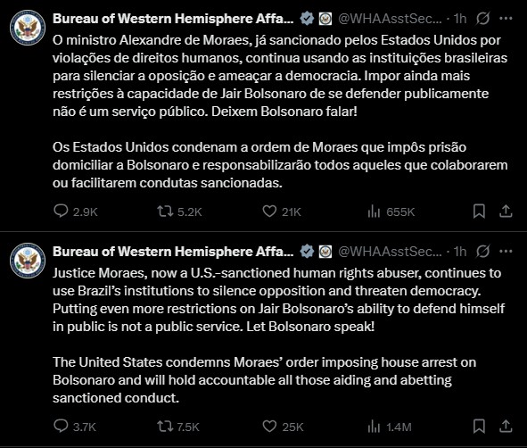 O Escritório para Assuntos do Hemisfério Ocidental do Departamento de Estado dos Estados Unidos publicou, na rede social X, que Moraes é um “violador de direitos humanos”, que usa as instituições brasileiras para “silenciar a oposição e ameaçar a democracia”.